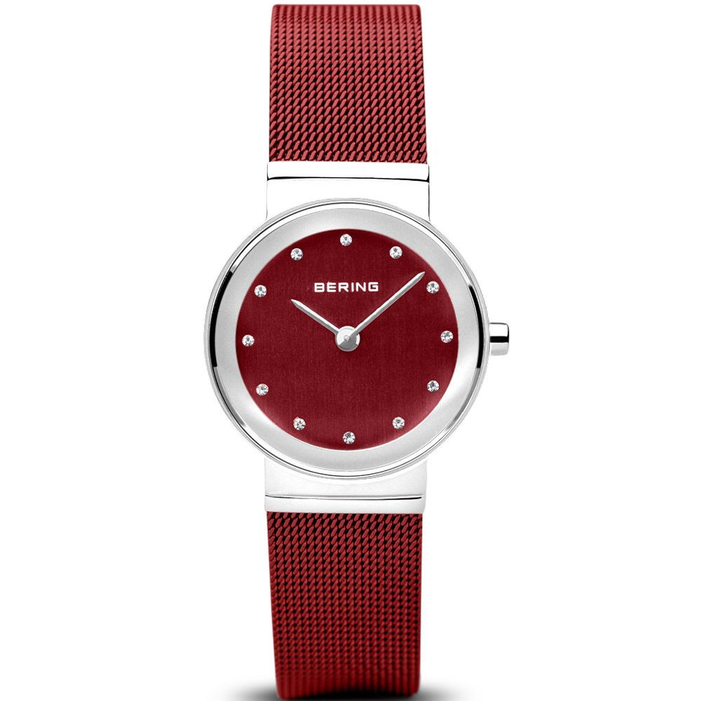 The material of the Bering Classic women's watch 10126-303 watch case is stainless steel, its color is silver, the material of the strap is stainless steel and its color is red. The diameter of the watch case is 26 mm, its shape is wheel. The glass of the watch is sapphire (scratch free), its mechanism is quartz, and its water resistance is 5 atm (50m) (highly drop resistant).