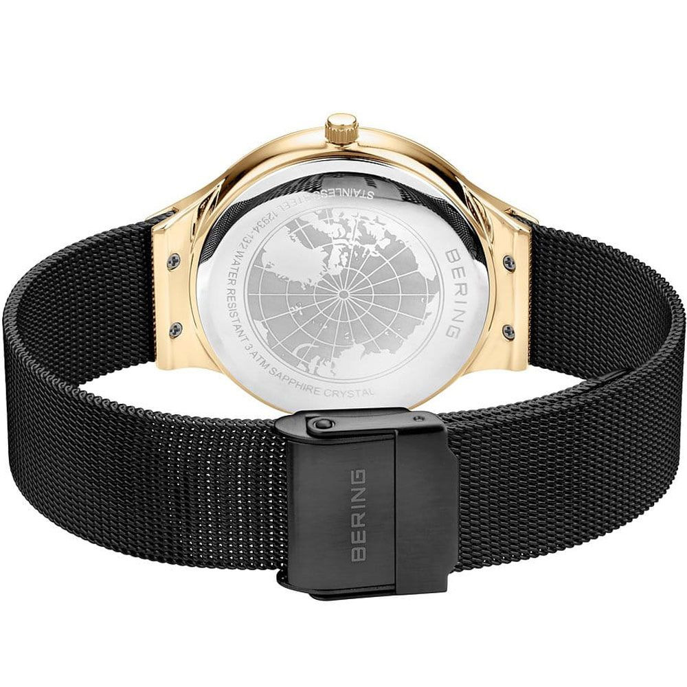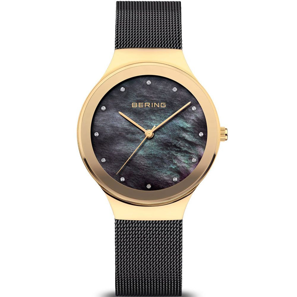 The material of the Bering Classic women's watch 12934-132 watch case is stainless steel, its color is gold, the material of the strap is stainless steel and its color is black. The diameter of the watch case is 34 mm, its shape is wheel. The glass of the watch is sapphire (scratch free), its mechanism is quartz, and its water resistance is 3 atm (30m) (drip-free).