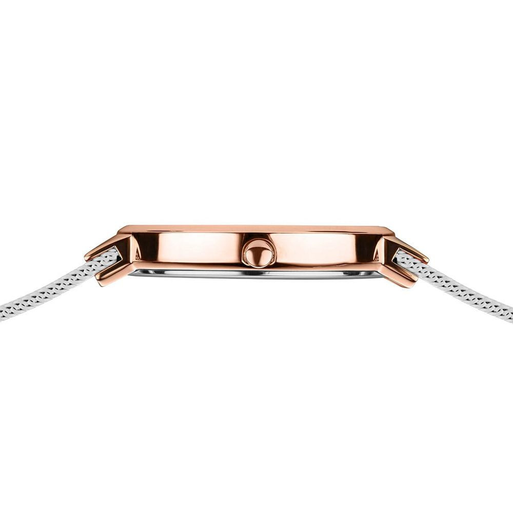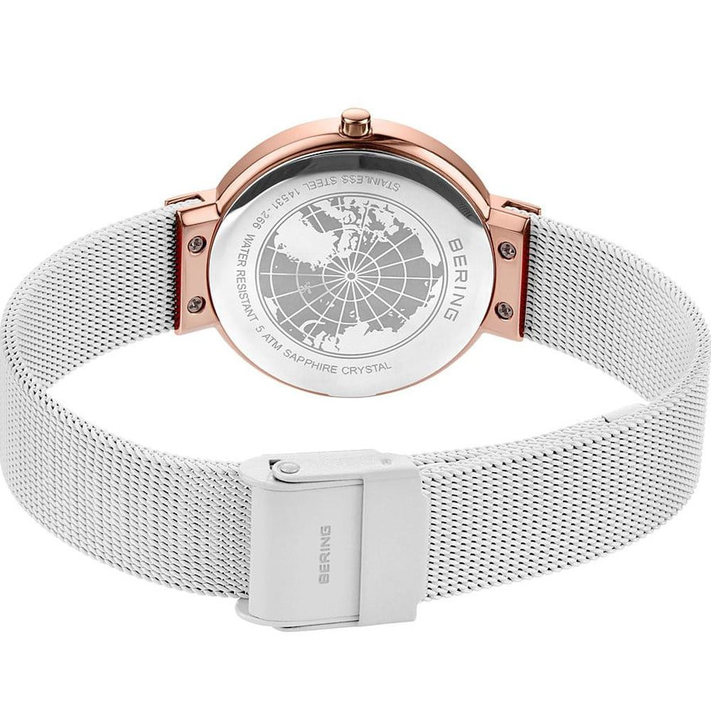 The material of the Bering Classic women's watch 14531-266 watch case is stainless steel, its color is rose gold, the material of the strap is stainless steel and its color is white. The diameter of the watch case is 31 mm, its shape is wheel. The glass of the watch is sapphire (scratch free), its mechanism is quartz, and its water resistance is 5 atm (50m) (highly drop resistant).