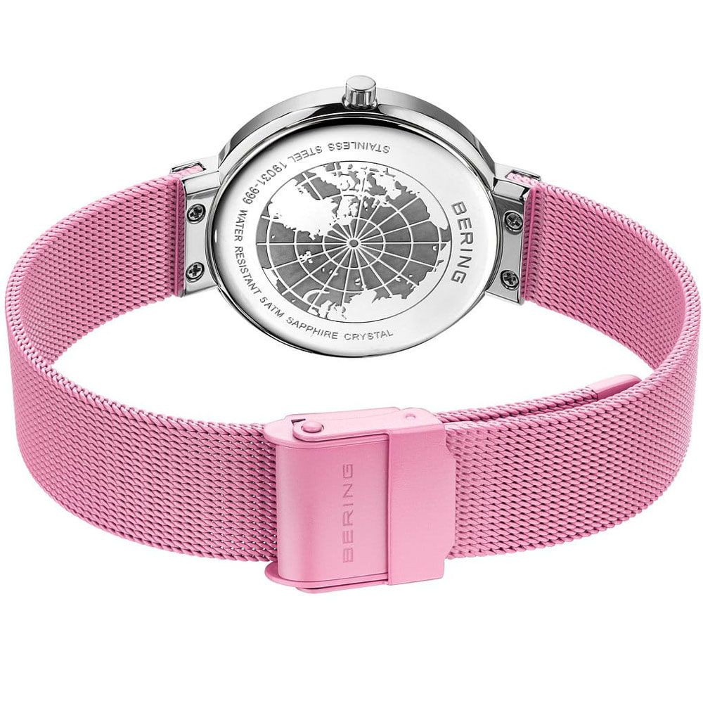 The material of the Bering Classic women's watch 19031-999 watch case is stainless steel, its color is silver, the material of the strap is stainless steel and its color is pink. The diameter of the watch case is 31 mm, its shape is wheel. The glass of the watch is sapphire (scratch free), its mechanism is quartz, and its water resistance is 5 atm (50m) (highly drop resistant).