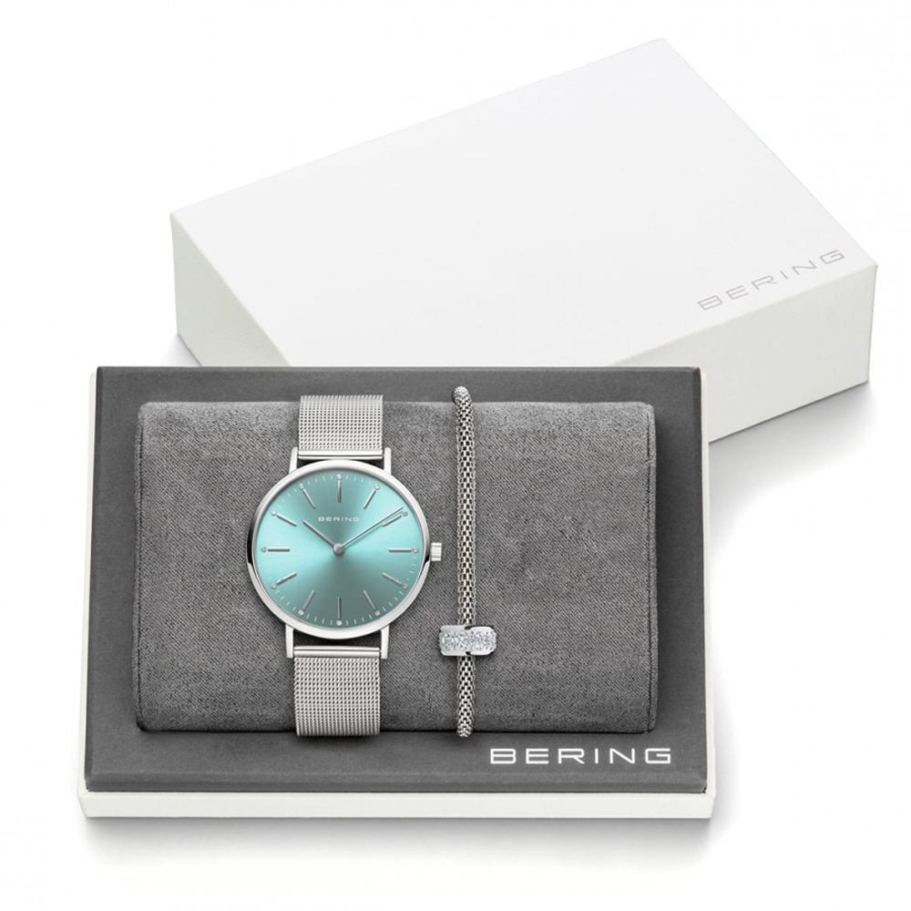 The material of the Bering Classic women's watch set 14134-005-GWP watch case is stainless steel, its color is silver, the material of the strap is stainless steel and its color is silver. The diameter of the watch case is 34 mm, its shape is wheel. The glass of the watch is sapphire (scratch free), its mechanism is quartz, and its water resistance is 3 atm (30m) (drip-free).