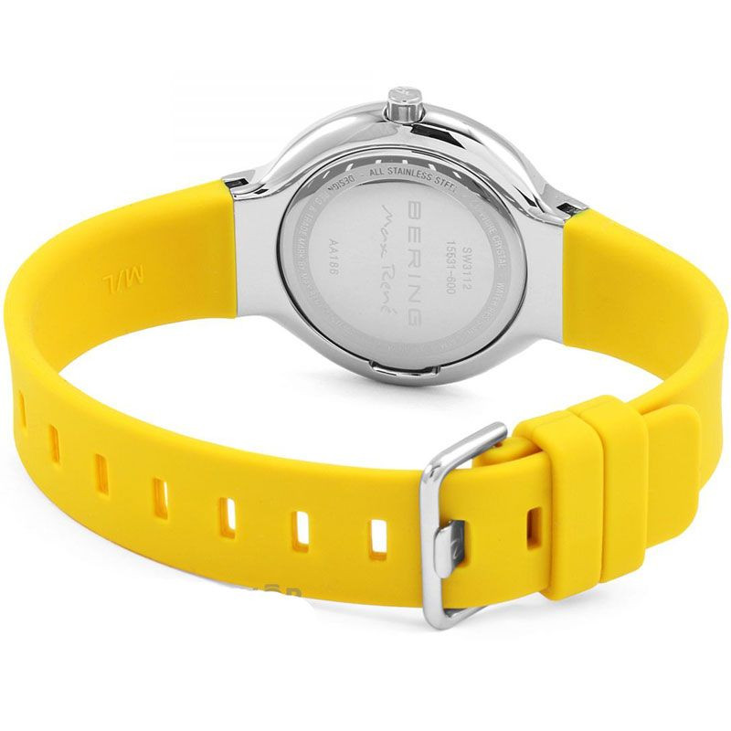 The material of the Bering Max Rene women's watch 15531-600 watch case is stainless steel, its color is silver, the material of the strap is silicon and its color is yellow. The diameter of the watch case is 31 mm, its shape is wheel. The glass of the watch is sapphire (scratch free), its mechanism is quartz, and its water resistance is 5 atm (50m) (highly drop resistant).