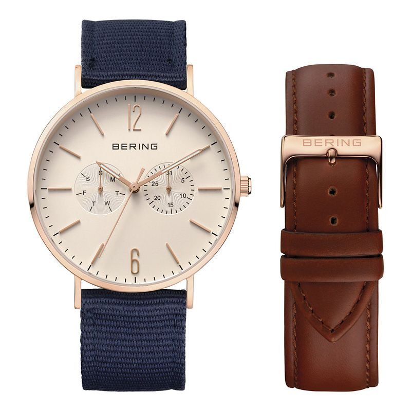 The material of the Bering men's watch 14240-564 watch case is stainless steel, its color is gold, the material of the strap is Bőr,Szövet and its color is Barna,Kék. The diameter of the watch case is 40 mm, its shape is wheel. The glass of the watch is sapphire (scratch free), its mechanism is quartz, and its water resistance is 3 atm (30m) (drip-free).