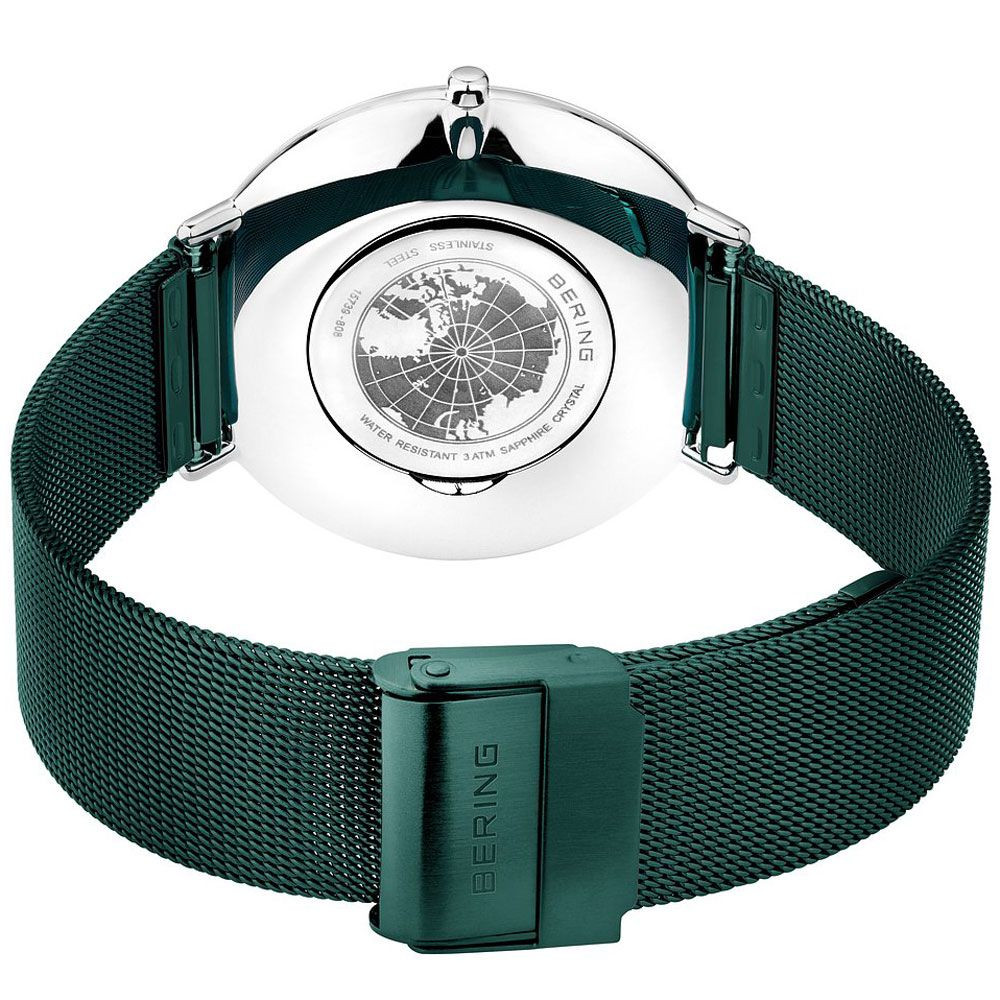 The material of the Bering Ultra Slim unisex watch 15739-808 watch case is stainless steel, its color is silver, the material of the strap is stainless steel and its color is green. The diameter of the watch case is 39 mm, its shape is wheel. The glass of the watch is sapphire (scratch free), its mechanism is quartz, and its water resistance is 3 atm (30m) (drip-free).