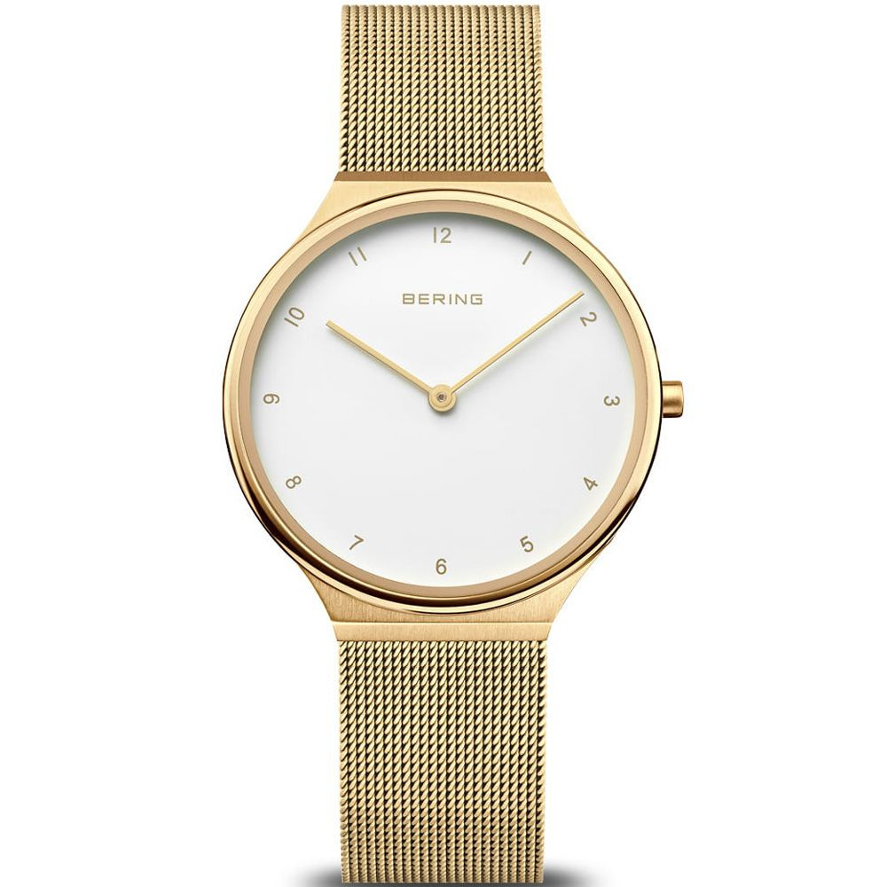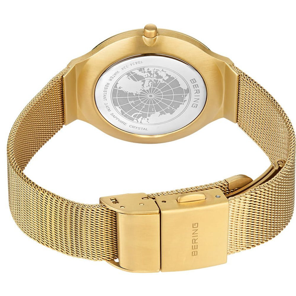The material of the Bering Ultra Slim women's watch 18434-334 watch case is stainless steel, its color is gold, the material of the strap is stainless steel and its color is gold. The diameter of the watch case is 34 mm, its shape is wheel. The glass of the watch is sapphire (scratch free), its mechanism is quartz, and its water resistance is 3 atm (30m) (drip-free).