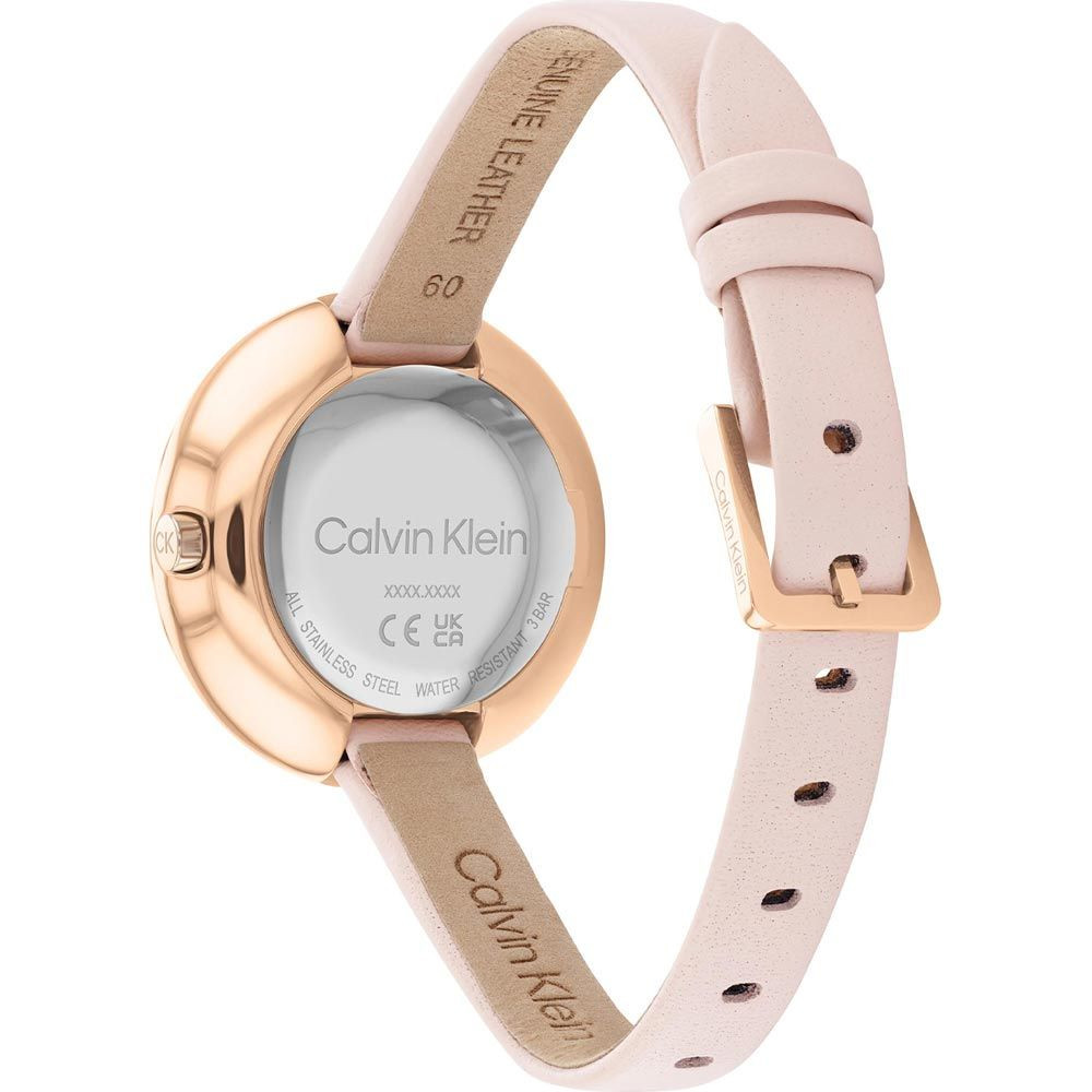 The material of the Calvin Klein Sculptural Confidence women's watch CK25200025 watch case is stainless steel, its color is rose gold, the material of the strap is leather and its color is pink. The diameter of the watch case is 32 mm, its shape is wheel. The glass of the watch is crystal (difficult to scratch), its mechanism is quartz, and its water resistance is 3 atm (30m) (drip-free).