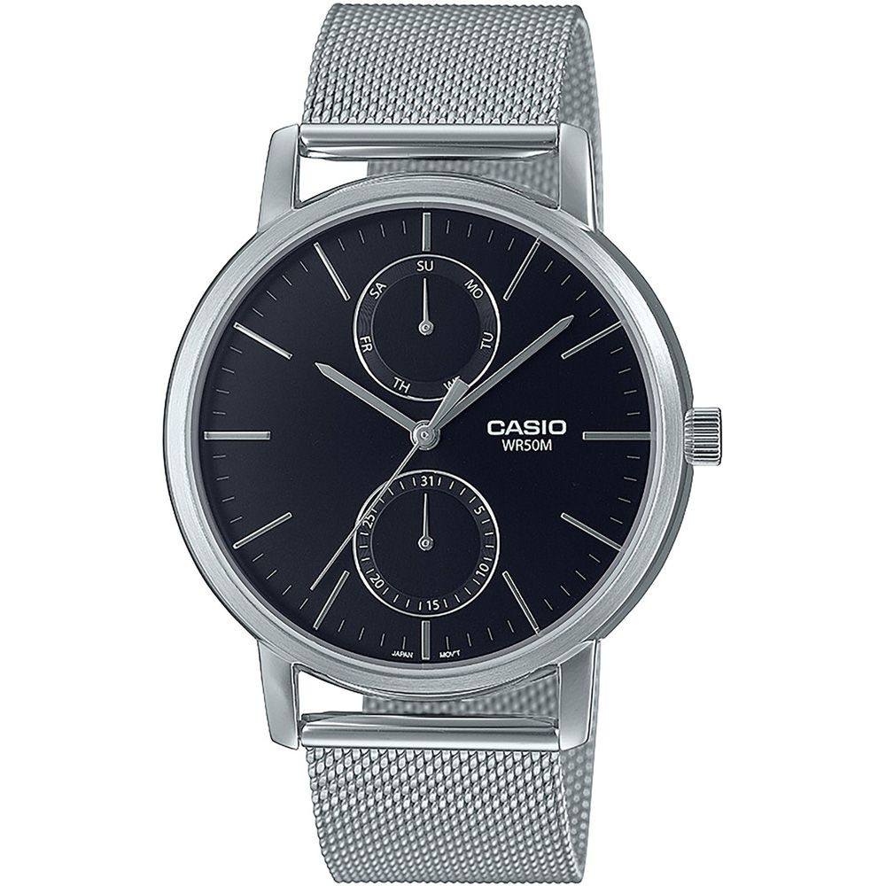 The material of the Casio Collection men's watch MTP-B310M-1AVEF watch case is stainless steel, its color is silver, the material of the strap is stainless steel and its color is silver. The diameter of the watch case is 41 mm, its shape is wheel. The glass of the watch is crystal (difficult to scratch), its mechanism is quartz, and its water resistance is 5 atm (50m) (highly drop resistant).