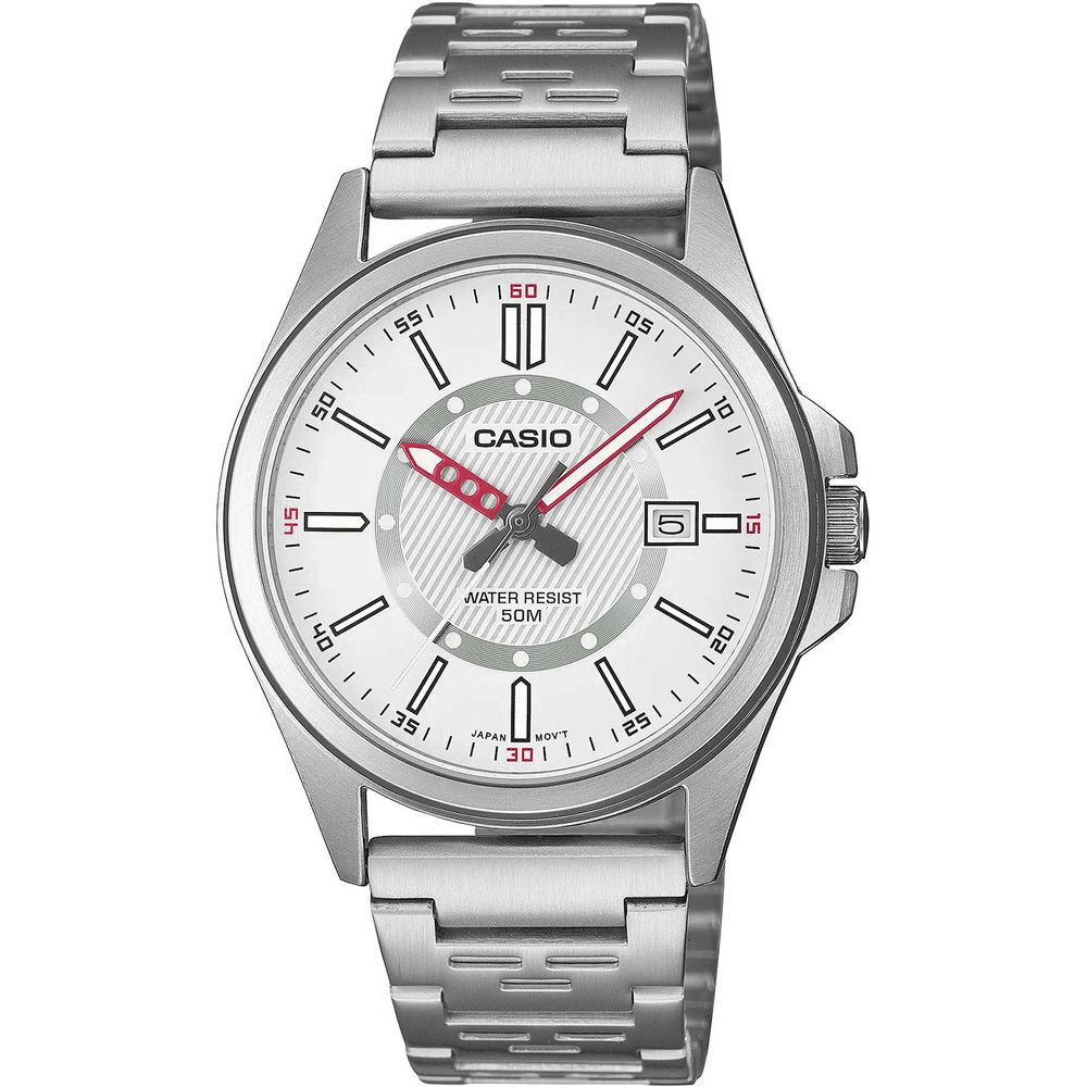 The material of the Casio Collection men's watch MTP-E700D-7EVEF watch case is stainless steel, its color is silver, the material of the strap is stainless steel and its color is silver. The diameter of the watch case is 40 mm, its shape is wheel. The glass of the watch is crystal (difficult to scratch), its mechanism is quartz, and its water resistance is 5 atm (50m) (highly drop resistant).