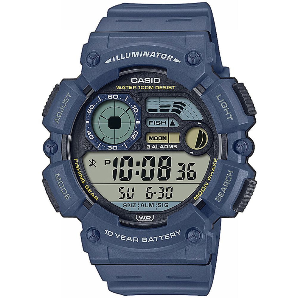 The material of the Casio Collection men's watch WS-1500H-2AVEF watch case is plastic, its color is blue, the material of the strap is plastic and its color is blue. The diameter of the watch case is 50 mm, its shape is wheel. The glass of the watch is plexiglas (plastic), its mechanism is quartz, and its water resistance is 10 atm (100m) (suitable for swimming).