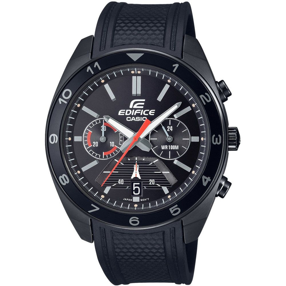 The material of the Casio Edifice men's watch EFV-590PB-1AVUEF watch case is stainless steel, its color is black, the material of the strap is plastic and its color is black. The diameter of the watch case is 44 mm, its shape is wheel. The glass of the watch is crystal (difficult to scratch), its mechanism is quartz, and its water resistance is 10 atm (100m) (suitable for swimming).