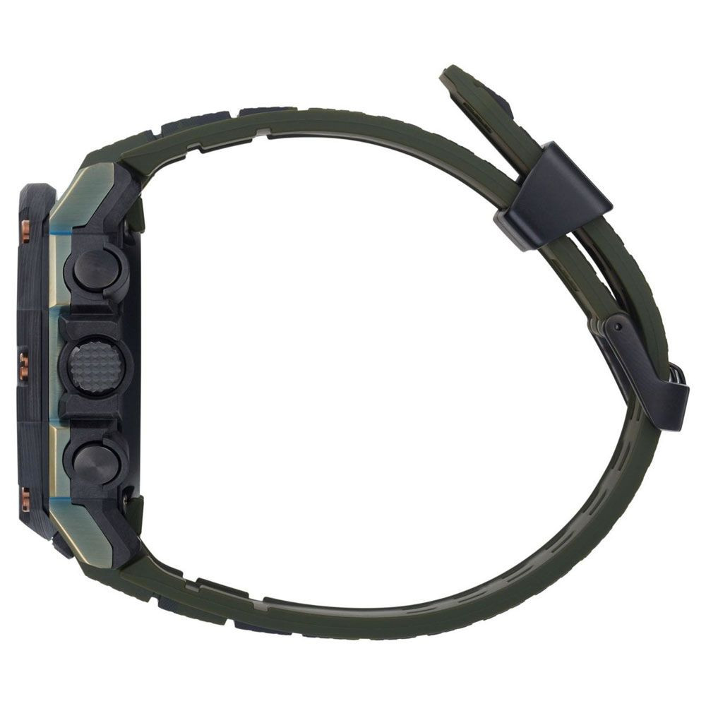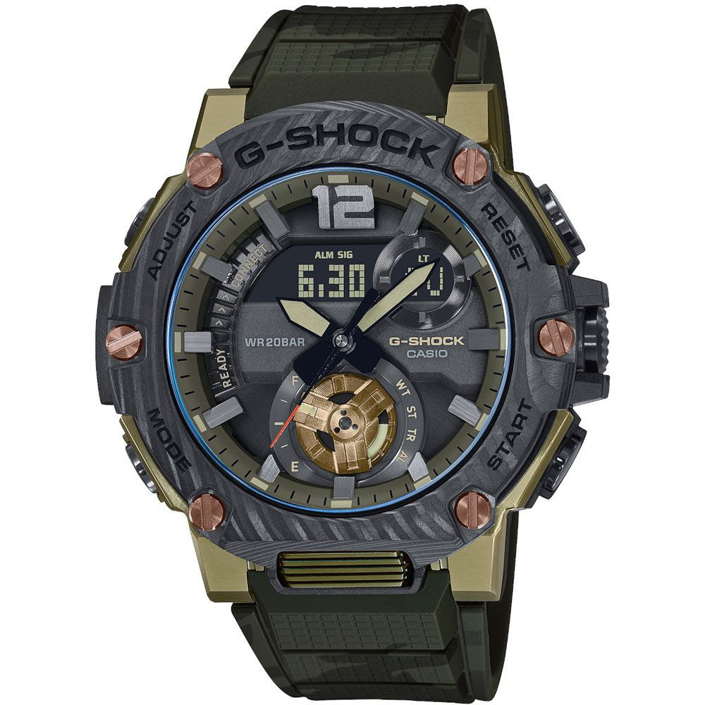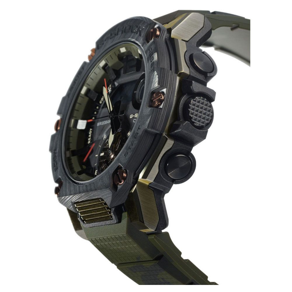 The material of the Casio G-Shock men's watch GST-B300XB-1A3ER watch case is Nemesacél,Műanyag, its color is Bronz,Fekete, the material of the strap is plastic and its color is Fekete,Zöld. The diameter of the watch case is 51 mm, its shape is wheel. The glass of the watch is sapphire (scratch free), its mechanism is solar, and its water resistance is 20 atm (200m) (suitable for diving).