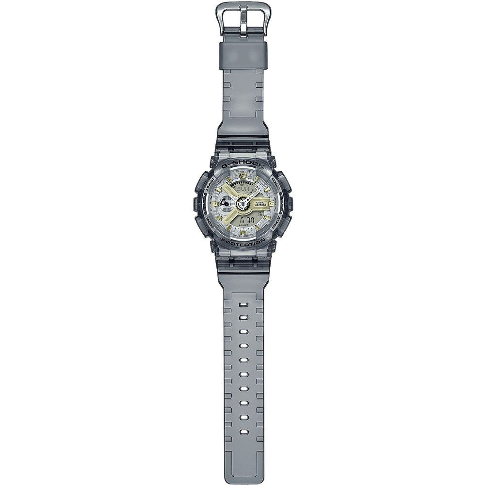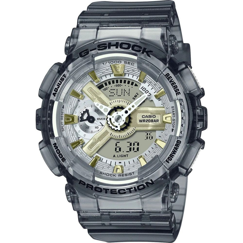 The material of the Casio G-Shock women's watch GMA-S110GS-8AER watch case is plastic, its color is Átlátszó,Szürke, the material of the strap is plastic and its color is Átlátszó,Szürke. The diameter of the watch case is 45 mm, its shape is wheel. The glass of the watch is crystal (difficult to scratch), its mechanism is quartz, and its water resistance is 20 atm (200m) (suitable for diving).