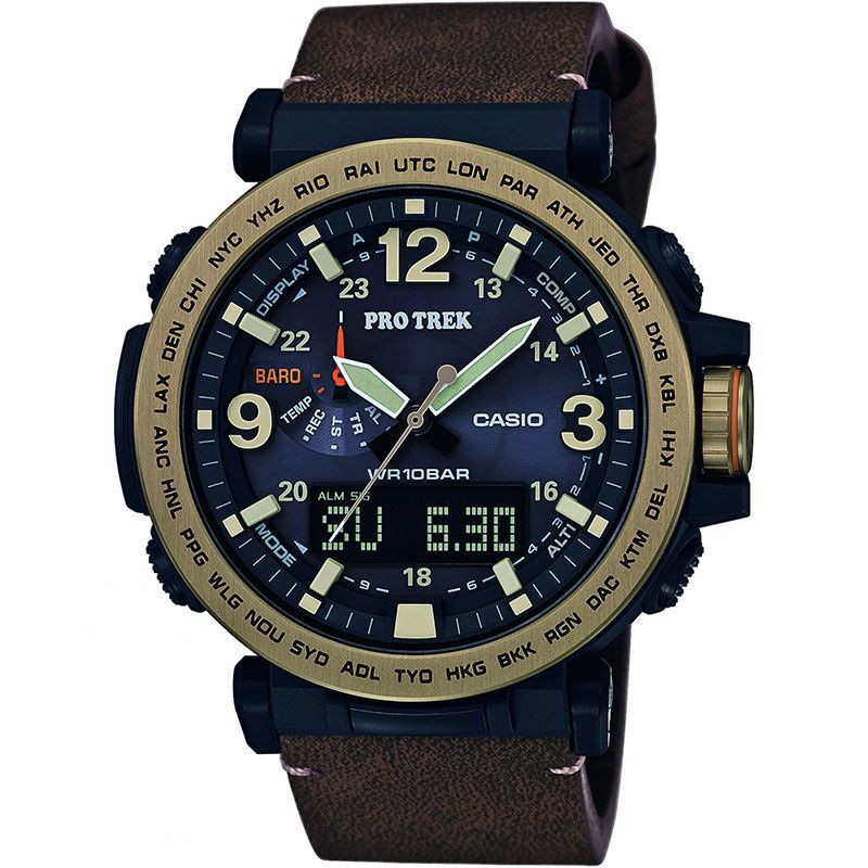 The material of the Casio Pro Trek men's watch PRG-600YL-5ER watch case is plastic, its color is black, the material of the strap is leather and its color is brown. The diameter of the watch case is 51 mm, its shape is wheel. The glass of the watch is crystal (difficult to scratch), its mechanism is quartz, and its water resistance is 10 atm (100m) (suitable for swimming).