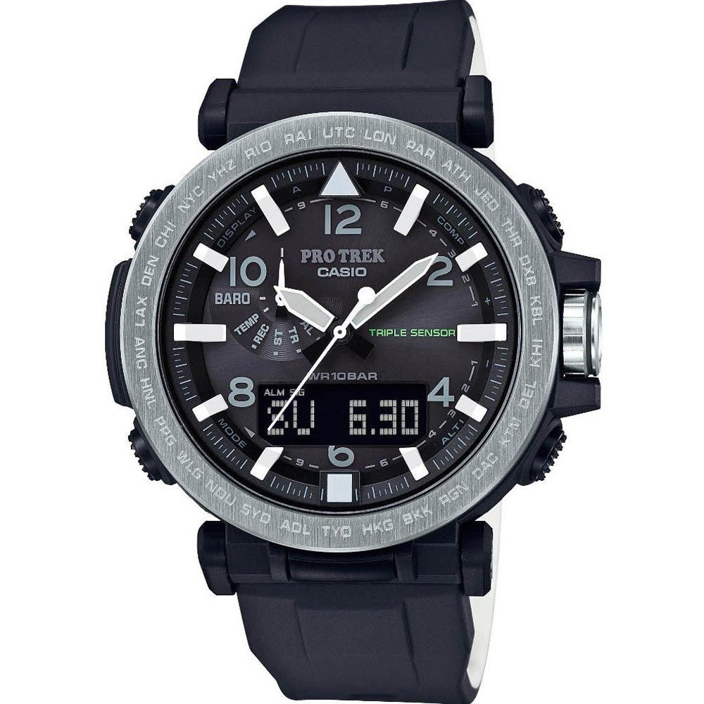 The material of the Casio Pro Trek men's watch PRG-650-1ER watch case is plastic, its color is black, the material of the strap is plastic and its color is black. The diameter of the watch case is 51 mm, its shape is wheel. The glass of the watch is crystal (difficult to scratch), its mechanism is solar, and its water resistance is 10 atm (100m) (suitable for swimming).