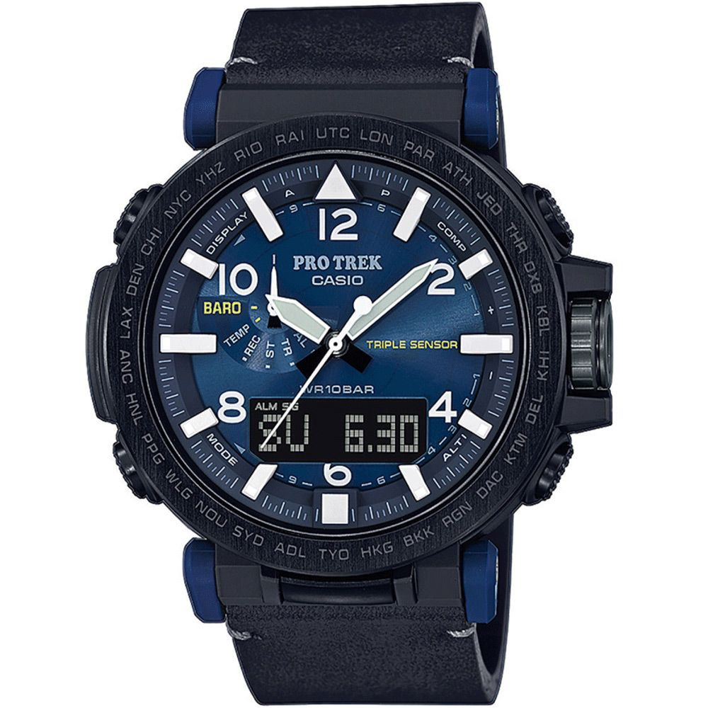 The material of the Casio Pro Trek men's watch PRG-650YL-2ER watch case is plastic, its color is black, the material of the strap is leather and its color is black. The diameter of the watch case is 51 mm, its shape is wheel. The glass of the watch is crystal (difficult to scratch), its mechanism is solar, and its water resistance is 10 atm (100m) (suitable for swimming).