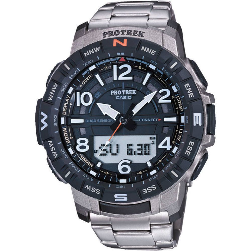 The material of the Casio Pro Trek men's watch PRT-B50T-7ER watch case is plastic, its color is gray, the material of the strap is titanium and its color is silver. The diameter of the watch case is 51 mm, its shape is wheel. The glass of the watch is crystal (difficult to scratch), its mechanism is quartz, and its water resistance is 10 atm (100m) (suitable for swimming).