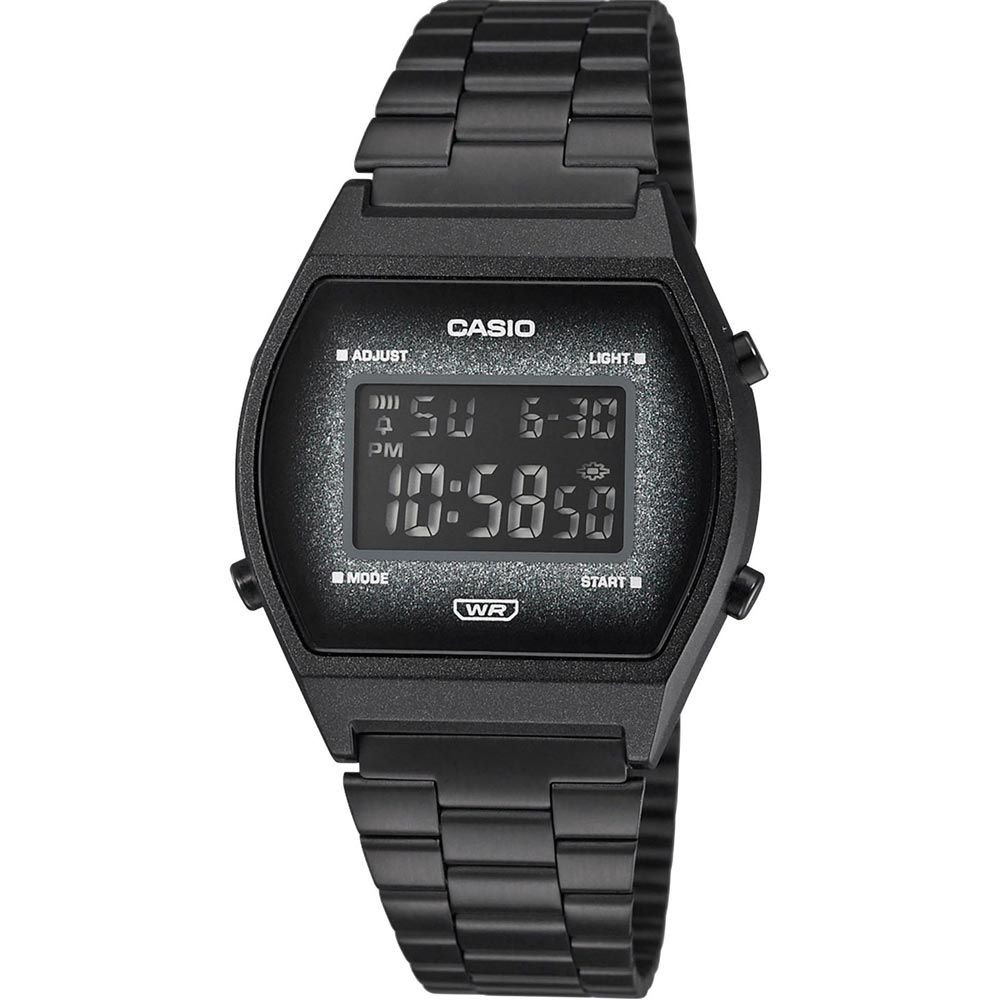 The material of the Casio Vintage women's watch B640WBG-1BEF watch case is plastic, its color is black, the material of the strap is stainless steel and its color is black. The diameter of the watch case is 35 mm, its shape is square. The glass of the watch is plexiglas (plastic), its mechanism is quartz, and its water resistance is 5 atm (50m) (highly drop resistant).