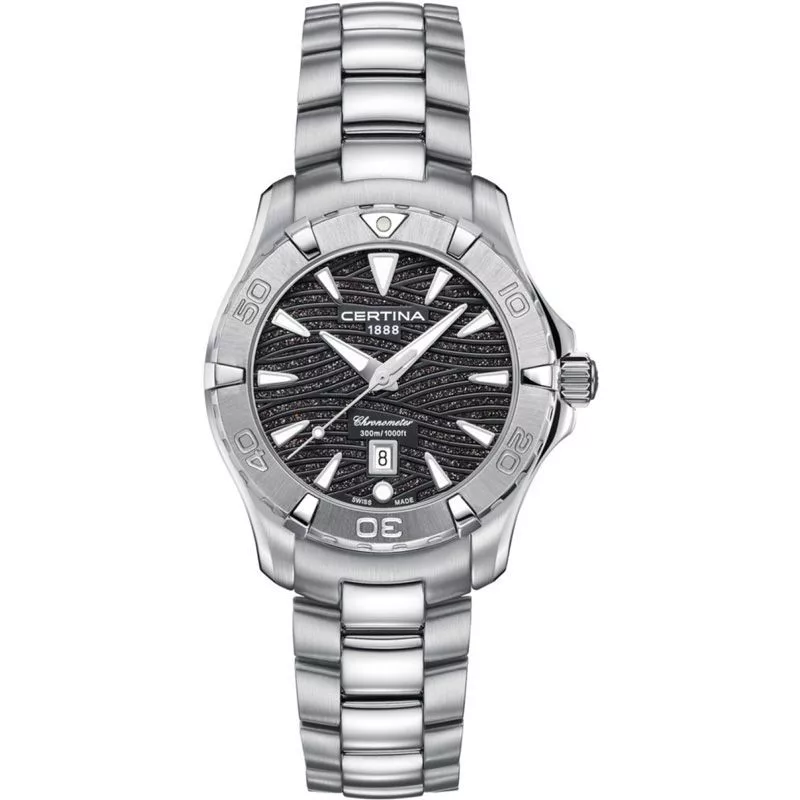 The material of the Certina DS Action women's watch C032.251.11.051.09 watch case is stainless steel, its color is silver, the material of the strap is stainless steel and its color is silver. The diameter of the watch case is 34 mm, its shape is wheel. The glass of the watch is sapphire (scratch free), its mechanism is quartz, and its water resistance is 30 atm (300m) (suitable for diving).