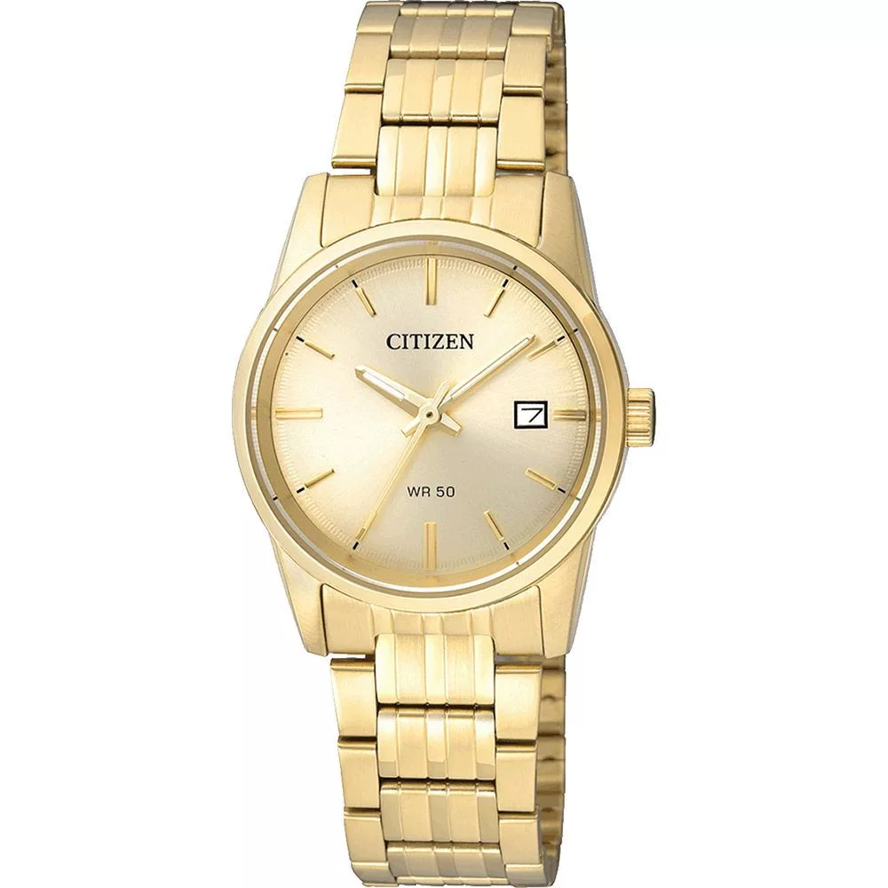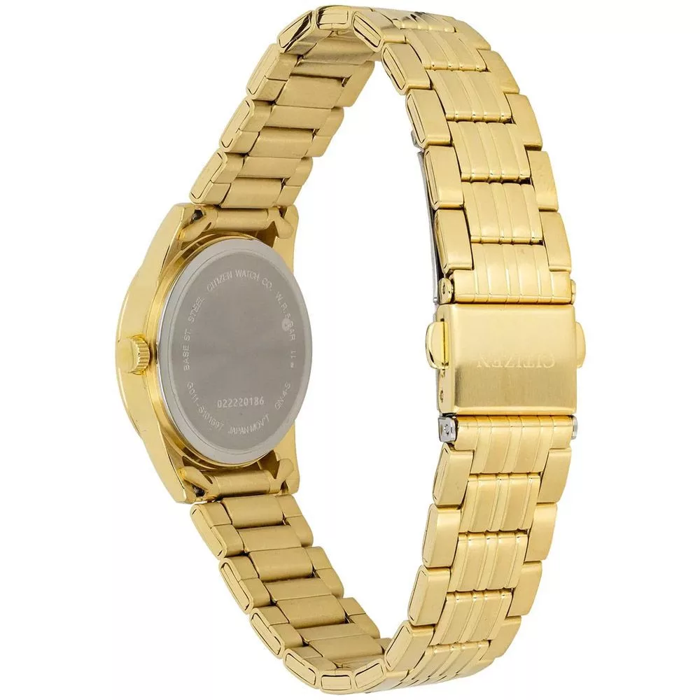 The material of the Citizen Elegance Lady women's watch EU6002-51P watch case is stainless steel, its color is gold, the material of the strap is stainless steel and its color is gold. The diameter of the watch case is 27 mm, its shape is wheel. The glass of the watch is crystal (difficult to scratch), its mechanism is quartz, and its water resistance is 5 atm (50m) (highly drop resistant).