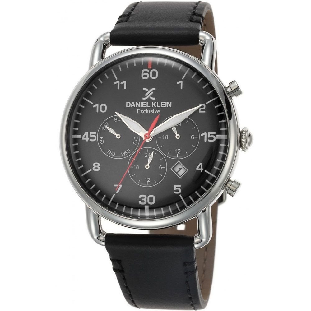The material of the Daniel Klein Exclusive men's watch DK.1.12479.2 watch case is metal alloy, its color is silver, the material of the strap is leather and its color is black. The diameter of the watch case is 45 mm, its shape is wheel. The glass of the watch is crystal (difficult to scratch), its mechanism is quartz, and its water resistance is 5 atm (50m) (highly drop resistant).