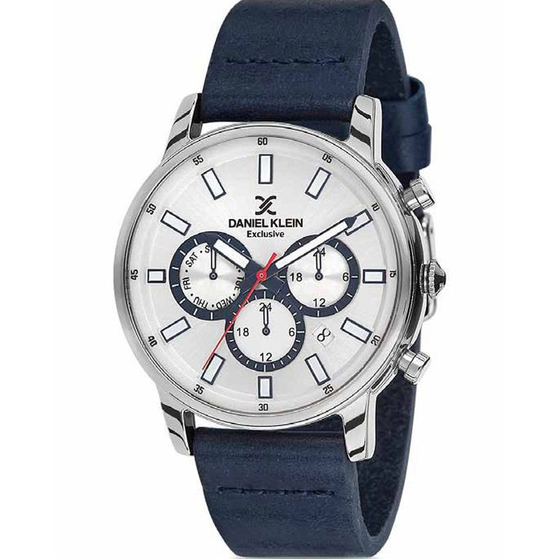 The material of the Daniel Klein Exclusive men's watch DK11716-5 watch case is metal alloy, its color is silver, the material of the strap is leather and its color is blue. The diameter of the watch case is 44 mm, its shape is wheel. The glass of the watch is crystal (difficult to scratch), its mechanism is quartz, and its water resistance is 3 atm (30m) (drip-free).