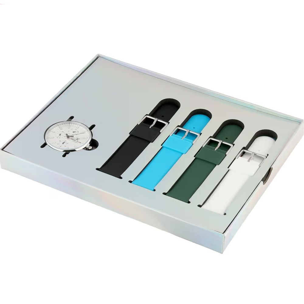The material of the Daniel Klein Exclusive men's watch set DK.1.13410-1 watch case is metal alloy, its color is silver, the material of the strap is silicon and its color is Fehér,Fekete,Kék,Zöld. The diameter of the watch case is 42 mm, its shape is wheel. The glass of the watch is crystal (difficult to scratch), its mechanism is quartz, and its water resistance is 5 atm (50m) (highly drop resistant).