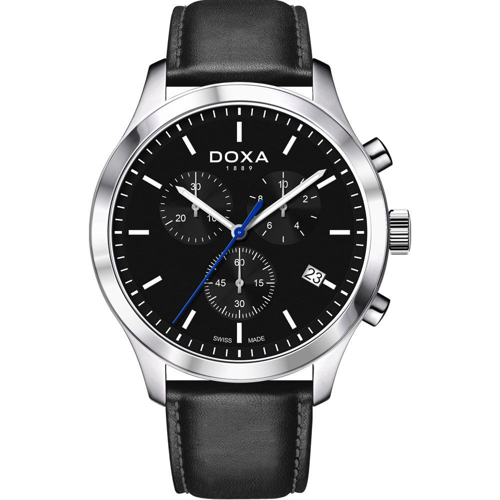 The material of the Doxa D-Chrono men's watch 165.10.101.01 watch case is stainless steel, its color is silver, the material of the strap is leather and its color is black. The diameter of the watch case is 45 mm, its shape is wheel. The glass of the watch is sapphire (scratch free), its mechanism is quartz, and its water resistance is 5 atm (50m) (highly drop resistant).