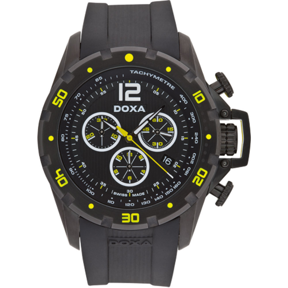 The material of the DOXA watch 703.70.083.20 watch case is stainless steel, its color is black, the material of the strap is silicon and its color is black. The diameter of the watch case is 44 mm, its shape is wheel. The glass of the watch is sapphire (scratch free), its mechanism is quartz, and its water resistance is 10 atm (100m) (suitable for swimming).