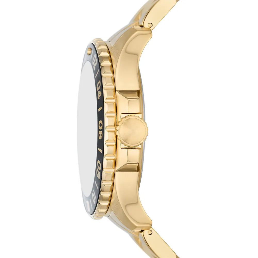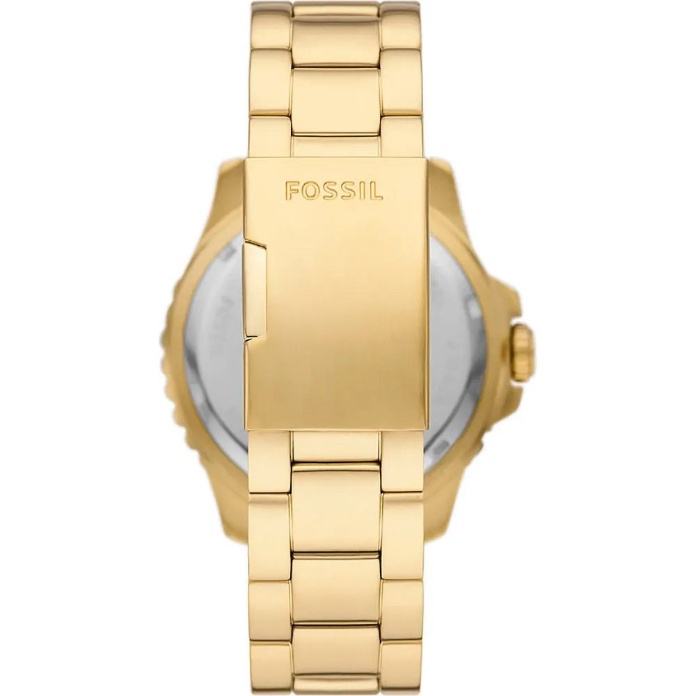 The material of the Fossil Blue GMT men's watch FS5990 watch case is stainless steel, its color is gold, the material of the strap is stainless steel and its color is gold. The diameter of the watch case is 46 mm, its shape is wheel. The glass of the watch is crystal (difficult to scratch), its mechanism is quartz, and its water resistance is 10 atm (100m) (suitable for swimming).