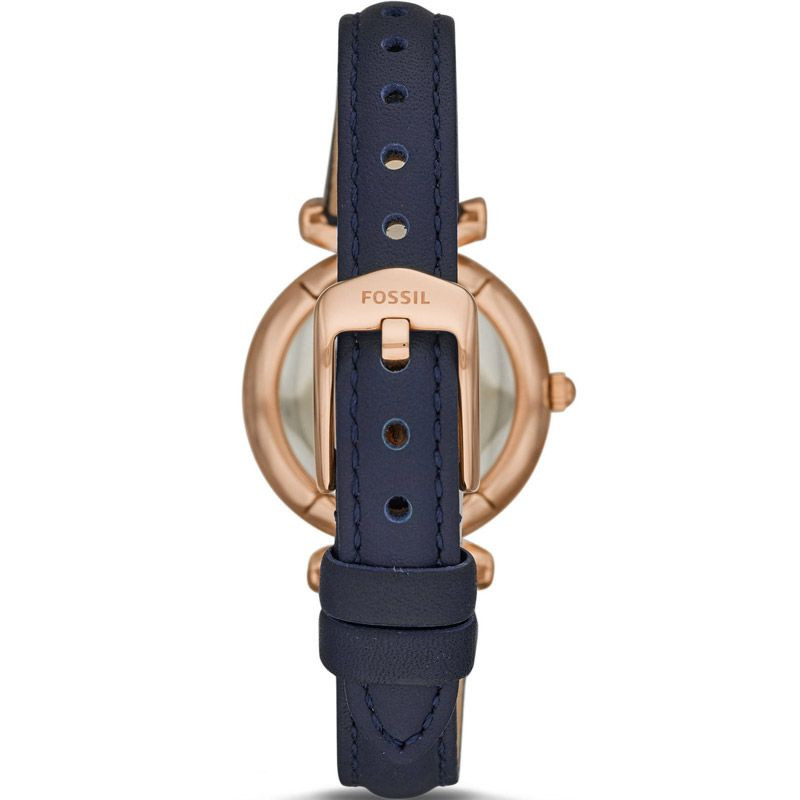 The material of the Fossil Carlie Mini women's watch ES4502 watch case is stainless steel, its color is rose gold, the material of the strap is leather and its color is blue. The diameter of the watch case is 28 mm, its shape is wheel. The glass of the watch is crystal (difficult to scratch), its mechanism is quartz, and its water resistance is 5 atm (50m) (highly drop resistant).