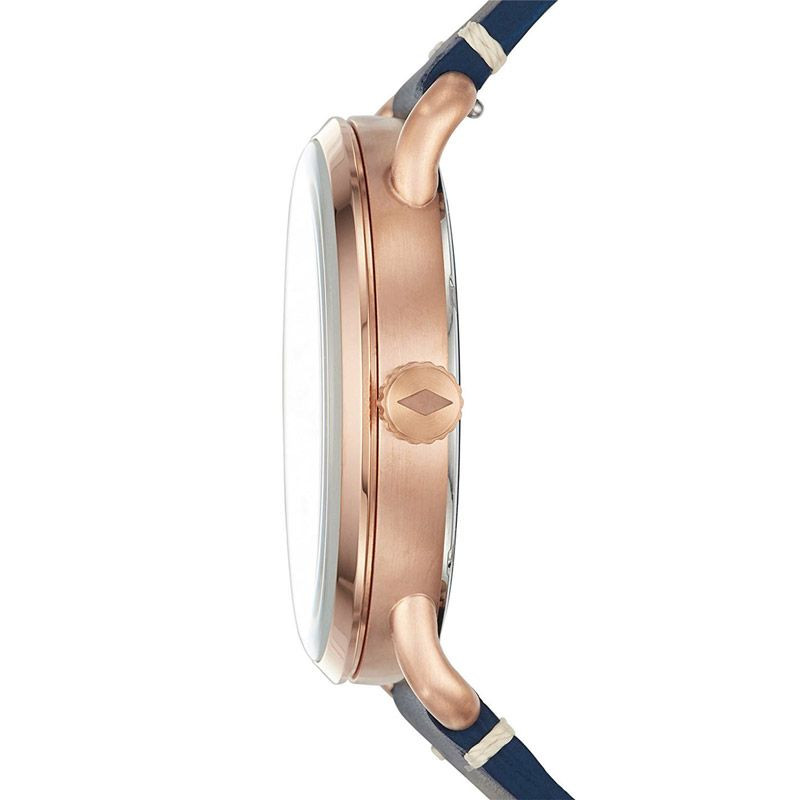 The material of the Fossil The Commuter men's watch FS5274 watch case is stainless steel, its color is rose gold, the material of the strap is leather and its color is blue. The diameter of the watch case is 42 mm, its shape is wheel. The glass of the watch is crystal (difficult to scratch), its mechanism is quartz, and its water resistance is 5 atm (50m) (highly drop resistant).