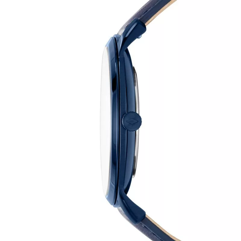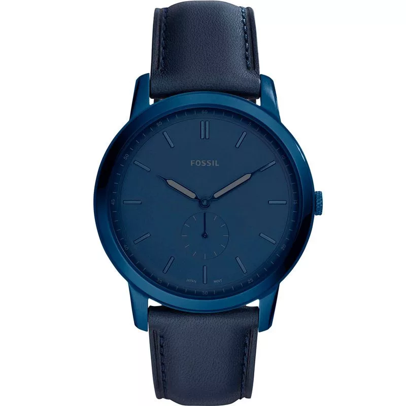 The material of the Fossil The Minimalist Mono men's watch FS5448 watch case is stainless steel, its color is blue, the material of the strap is leather and its color is blue. The diameter of the watch case is 44 mm, its shape is wheel. The glass of the watch is crystal (difficult to scratch), its mechanism is quartz, and its water resistance is 5 atm (50m) (highly drop resistant).