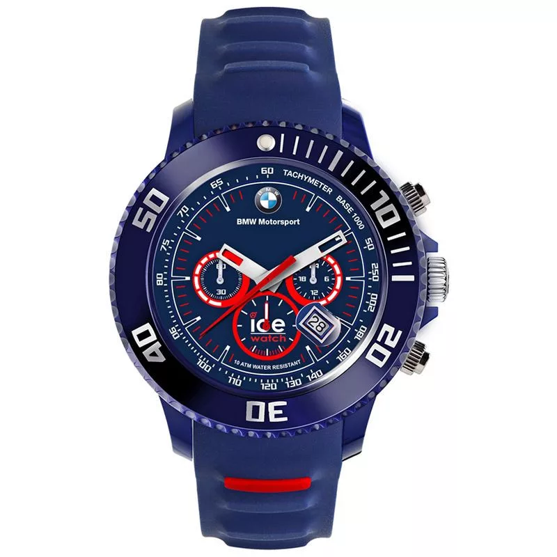The material of the Ice-Watch Bmw Motorsport men's watch BM.CH.BRD.B.S.14 watch case is plastic, its color is blue, the material of the strap is silicon and its color is blue. The diameter of the watch case is 48 mm, its shape is wheel. The glass of the watch is crystal (difficult to scratch), its mechanism is quartz, and its water resistance is 10 atm (100m) (suitable for swimming).
