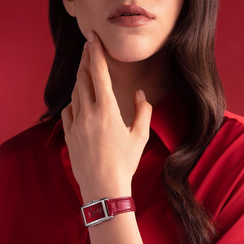 The material of the Longines DolceVita women's watch L5.512.4.91.2 watch case is stainless steel, its color is silver, the material of the strap is leather and its color is red. The diameter of the watch case is 35 mm, its shape is wheel. The glass of the watch is sapphire (scratch free), its mechanism is quartz, and its water resistance is 3 atm (30m) (drip-free).