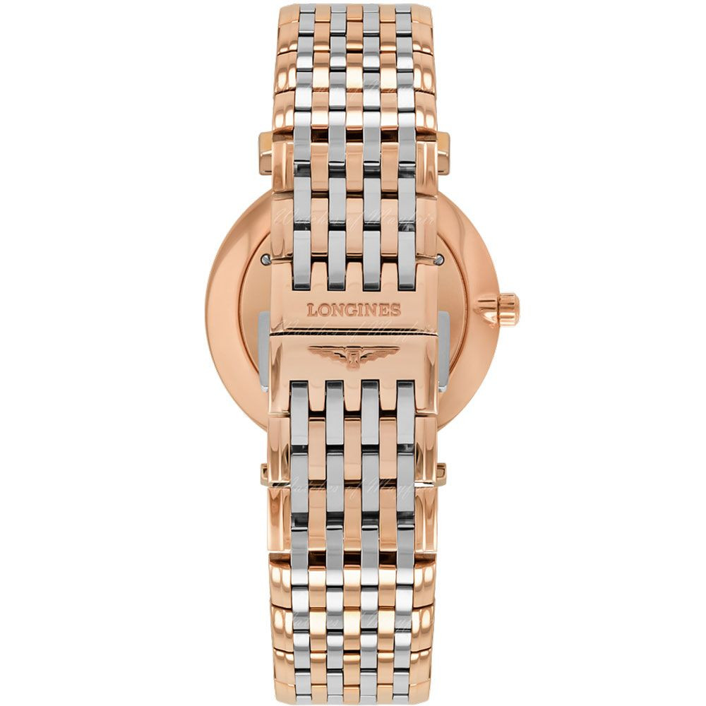 The material of the Longines La Grande Classique women's watch L4.512.1.57.7 watch case is stainless steel, its color is rose gold, the material of the strap is stainless steel and its color is Ezüst,Rose gold. The diameter of the watch case is 29 mm, its shape is wheel. The glass of the watch is sapphire (scratch free), its mechanism is quartz, and its water resistance is 3 atm (30m) (drip-free).