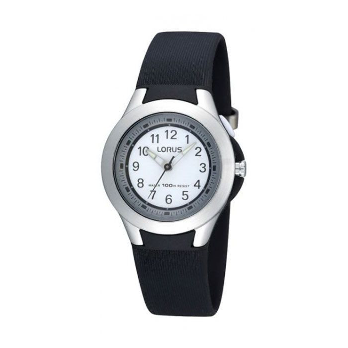 The material of the Lorus child watch R2305FX-9 watch case is plastic, its color is silver, the material of the strap is silicon and its color is black. The diameter of the watch case is 28 mm, its shape is wheel. The glass of the watch is crystal (difficult to scratch), its mechanism is quartz, and its water resistance is 10 atm (100m) (suitable for swimming).