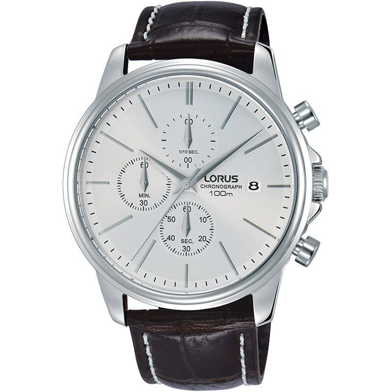 The material of the Lorus Dress men's watch RM325EX-8 watch case is stainless steel, its color is silver, the material of the strap is leather and its color is brown. The diameter of the watch case is 43 mm, its shape is wheel. The glass of the watch is crystal (difficult to scratch), its mechanism is quartz, and its water resistance is 10 atm (100m) (suitable for swimming).