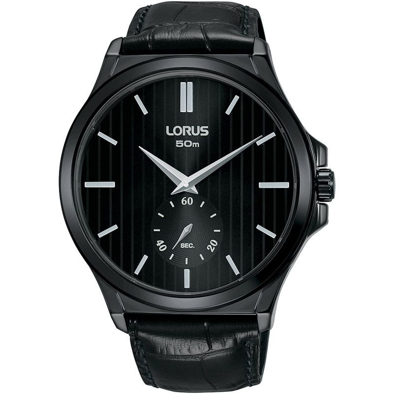 The material of the Lorus Dress men's watch RN429AX-9 watch case is stainless steel, its color is black, the material of the strap is leather and its color is black. The diameter of the watch case is 43 mm, its shape is wheel. The glass of the watch is crystal (difficult to scratch), its mechanism is quartz, and its water resistance is 5 atm (50m) (highly drop resistant).