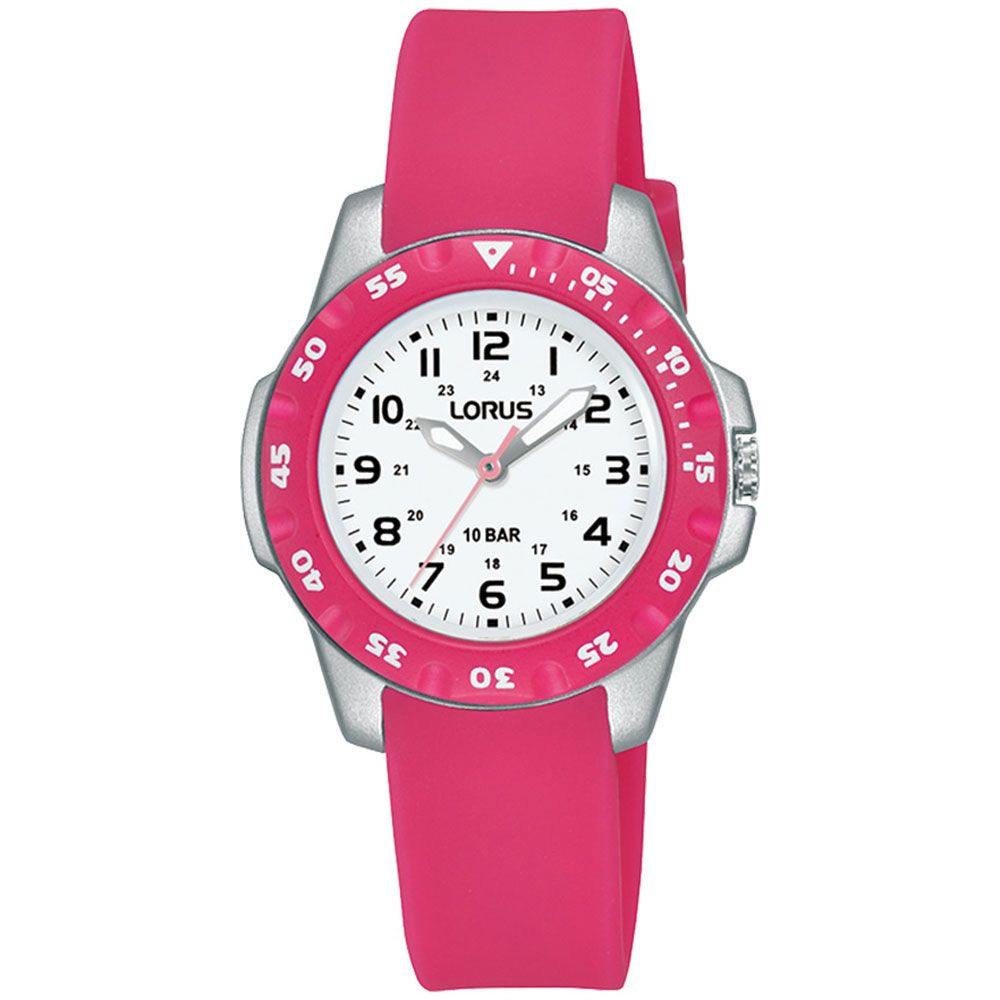 The material of the Lorus Kids child watch RRX59HX-9 watch case is plastic, its color is silver, the material of the strap is silicon and its color is pink. The diameter of the watch case is 29 mm, its shape is wheel. The glass of the watch is plexiglas (plastic), its mechanism is quartz, and its water resistance is 10 atm (100m) (suitable for swimming).