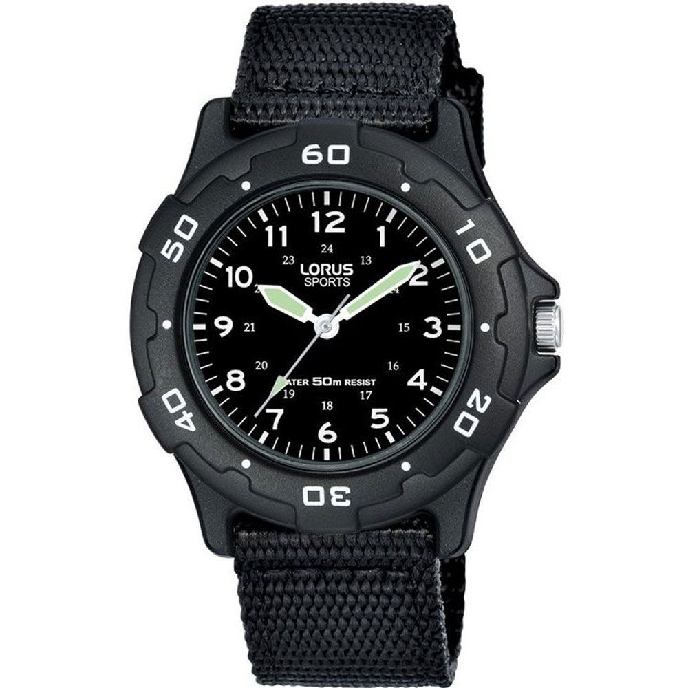 The material of the Lorus Kids child watch RRX89FX-9 watch case is plastic, its color is black, the material of the strap is fabric and its color is black. The diameter of the watch case is 36 mm, its shape is wheel. The glass of the watch is plexiglas (plastic), its mechanism is quartz, and its water resistance is 5 atm (50m) (highly drop resistant).