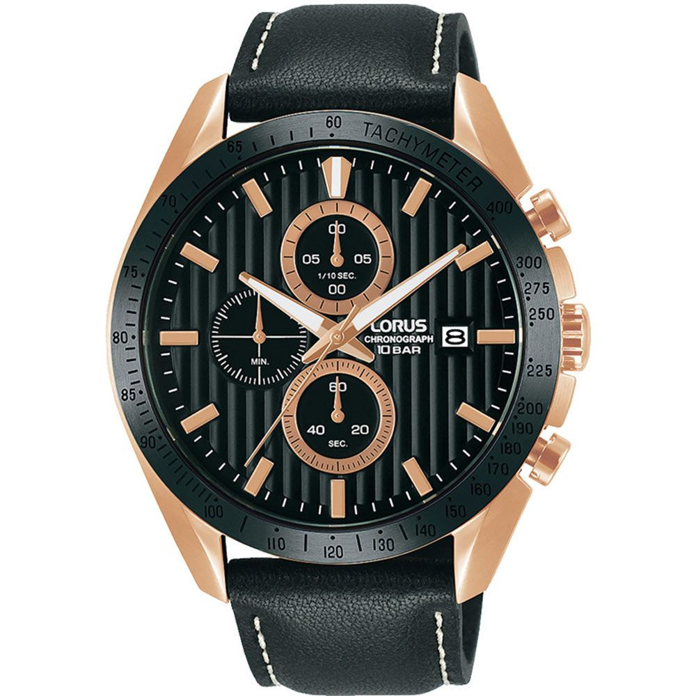 The material of the Lorus Sports men's watch RM308HX-9 watch case is stainless steel, its color is rose gold, the material of the strap is leather and its color is black. The diameter of the watch case is 45 mm, its shape is wheel. The glass of the watch is crystal (difficult to scratch), its mechanism is quartz, and its water resistance is 10 atm (100m) (suitable for swimming).