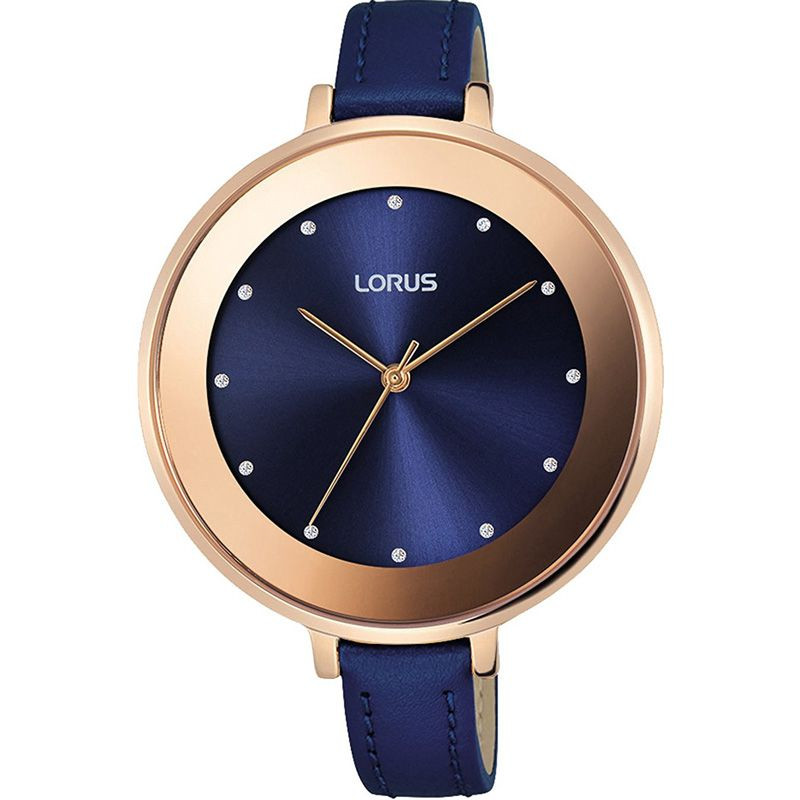 The material of the Lorus Women women's watch RG240LX-9 watch case is stainless steel, its color is rose gold, the material of the strap is leather and its color is blue. The diameter of the watch case is 40 mm, its shape is wheel. The glass of the watch is crystal (difficult to scratch), its mechanism is quartz, and its water resistance is 3 atm (30m) (drip-free).