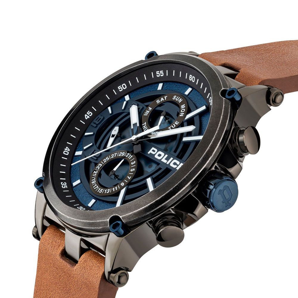 The material of the Police Taman men's watch PEWJF2108601 watch case is stainless steel, its color is gray, the material of the strap is leather and its color is brown. The diameter of the watch case is 47 mm, its shape is wheel. The glass of the watch is crystal (difficult to scratch), its mechanism is quartz, and its water resistance is 5 atm (50m) (highly drop resistant).