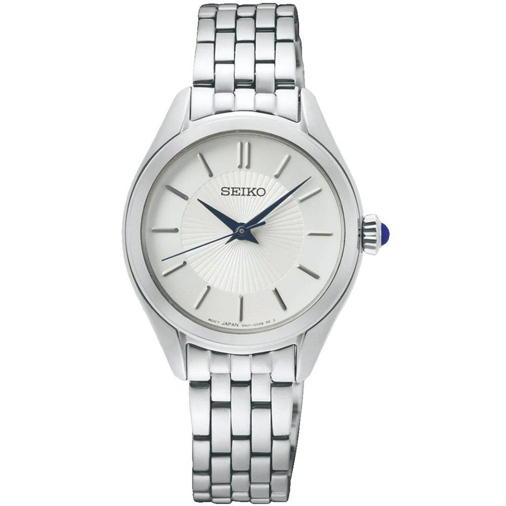 The material of the Seiko Classic women's watch SUR537P1 watch case is stainless steel, its color is silver, the material of the strap is stainless steel and its color is silver. The diameter of the watch case is 29 mm, its shape is wheel. The glass of the watch is crystal (difficult to scratch), its mechanism is quartz, and its water resistance is 3 atm (30m) (drip-free).