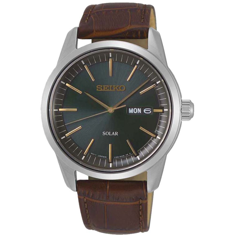 The material of the Seiko Solar men's watch SNE529P1 watch case is stainless steel, its color is silver, the material of the strap is leather and its color is brown. The diameter of the watch case is 40 mm, its shape is wheel. The glass of the watch is sapphire (scratch free), its mechanism is solar, and its water resistance is 10 atm (100m) (suitable for swimming).