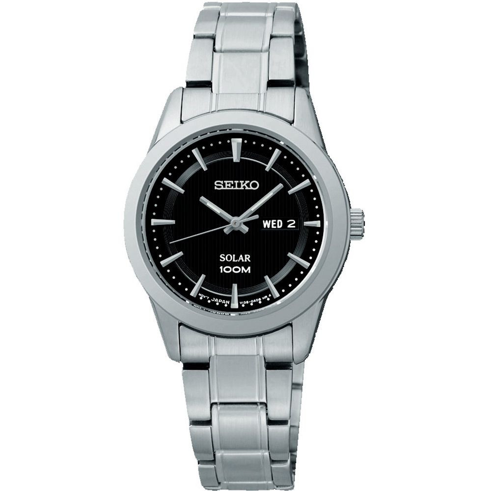 The material of the Seiko Solar women's watch SUT161P1 watch case is stainless steel, its color is silver, the material of the strap is stainless steel and its color is silver. The diameter of the watch case is 29 mm, its shape is wheel. The glass of the watch is crystal (difficult to scratch), its mechanism is solar, and its water resistance is 10 atm (100m) (suitable for swimming).