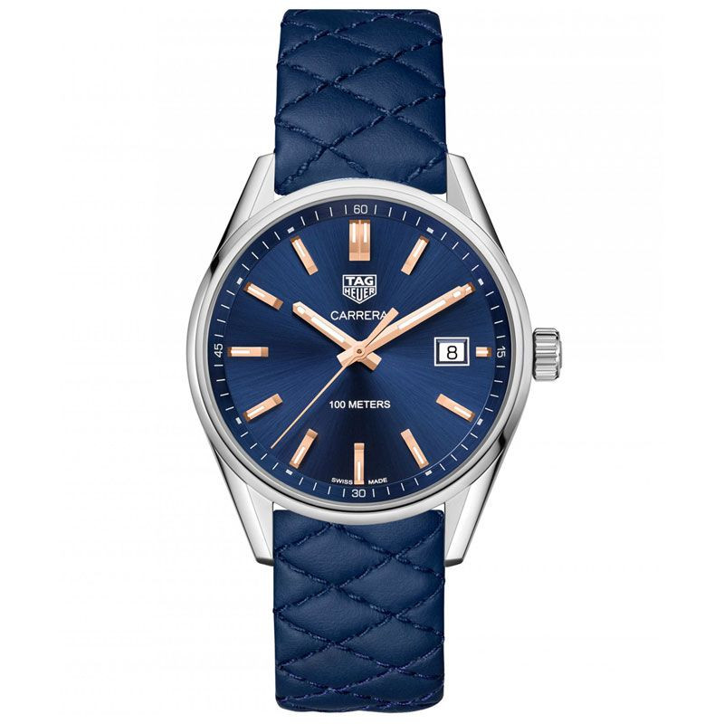 The material of the Tag Heuer Carrera women's watch WAR1112.FC6391 watch case is stainless steel, its color is silver, the material of the strap is leather and its color is blue. The diameter of the watch case is 39 mm, its shape is wheel. The glass of the watch is sapphire (scratch free), its mechanism is quartz, and its water resistance is 10 atm (100m) (suitable for swimming).