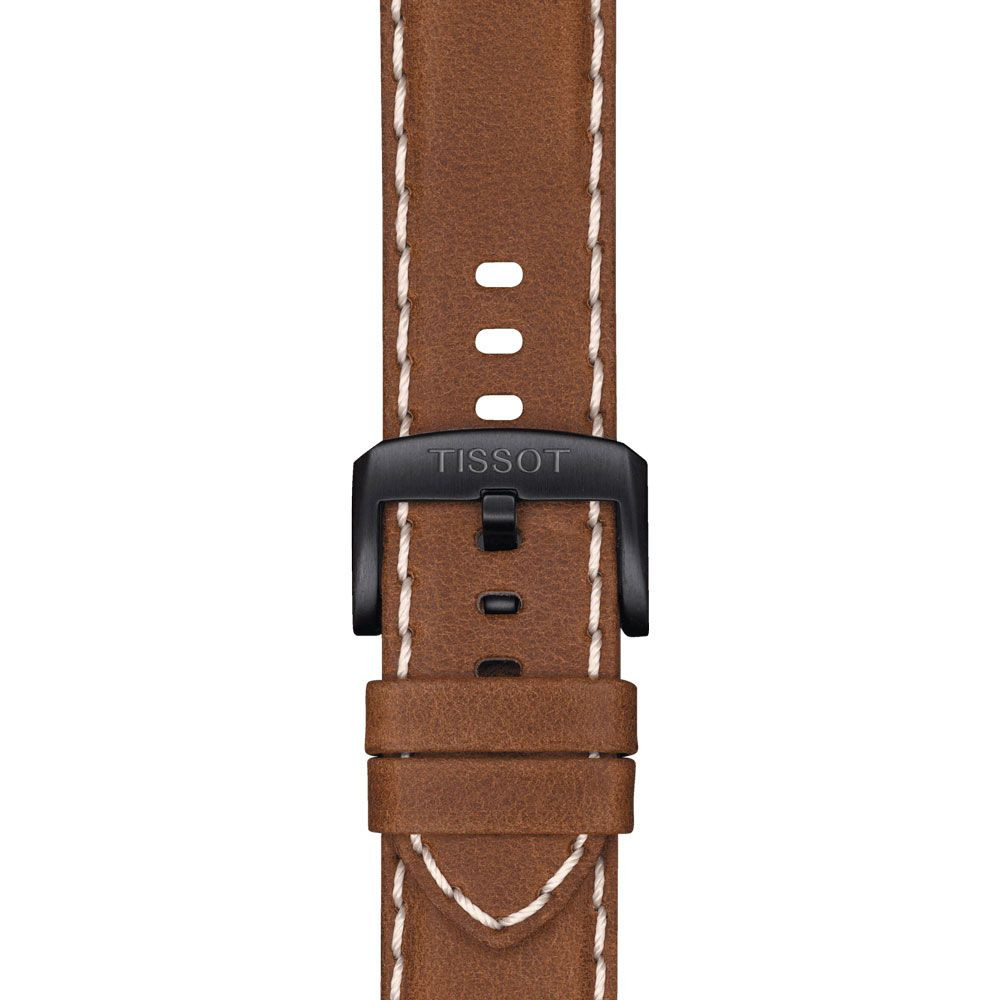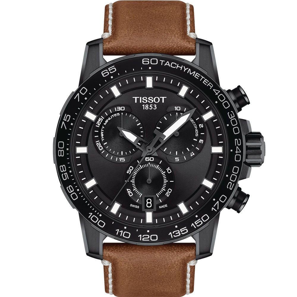 The material of the Tissot T-Sport Supersport Chrono men's watch T125.617.36.051.01 watch case is stainless steel, its color is black, the material of the strap is leather and its color is brown. The diameter of the watch case is 45 mm, its shape is wheel. The glass of the watch is sapphire (scratch free), its mechanism is quartz, and its water resistance is 10 atm (100m) (suitable for swimming).