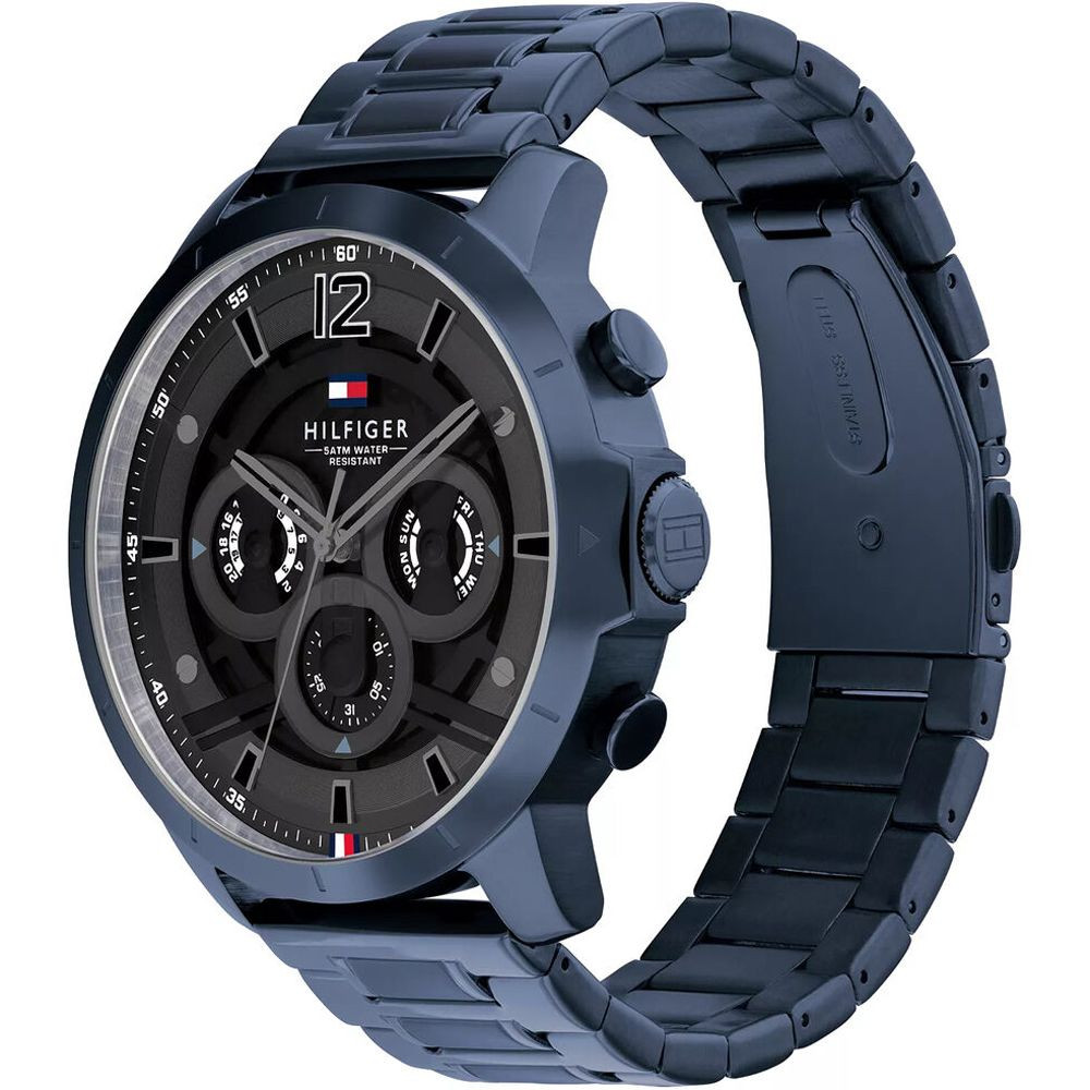 The material of the Tommy Hilfiger Luca men's watch TH1710493 watch case is stainless steel, its color is blue, the material of the strap is stainless steel and its color is blue. The diameter of the watch case is 50 mm, its shape is wheel. The glass of the watch is crystal (difficult to scratch), its mechanism is quartz, and its water resistance is 5 atm (50m) (highly drop resistant).